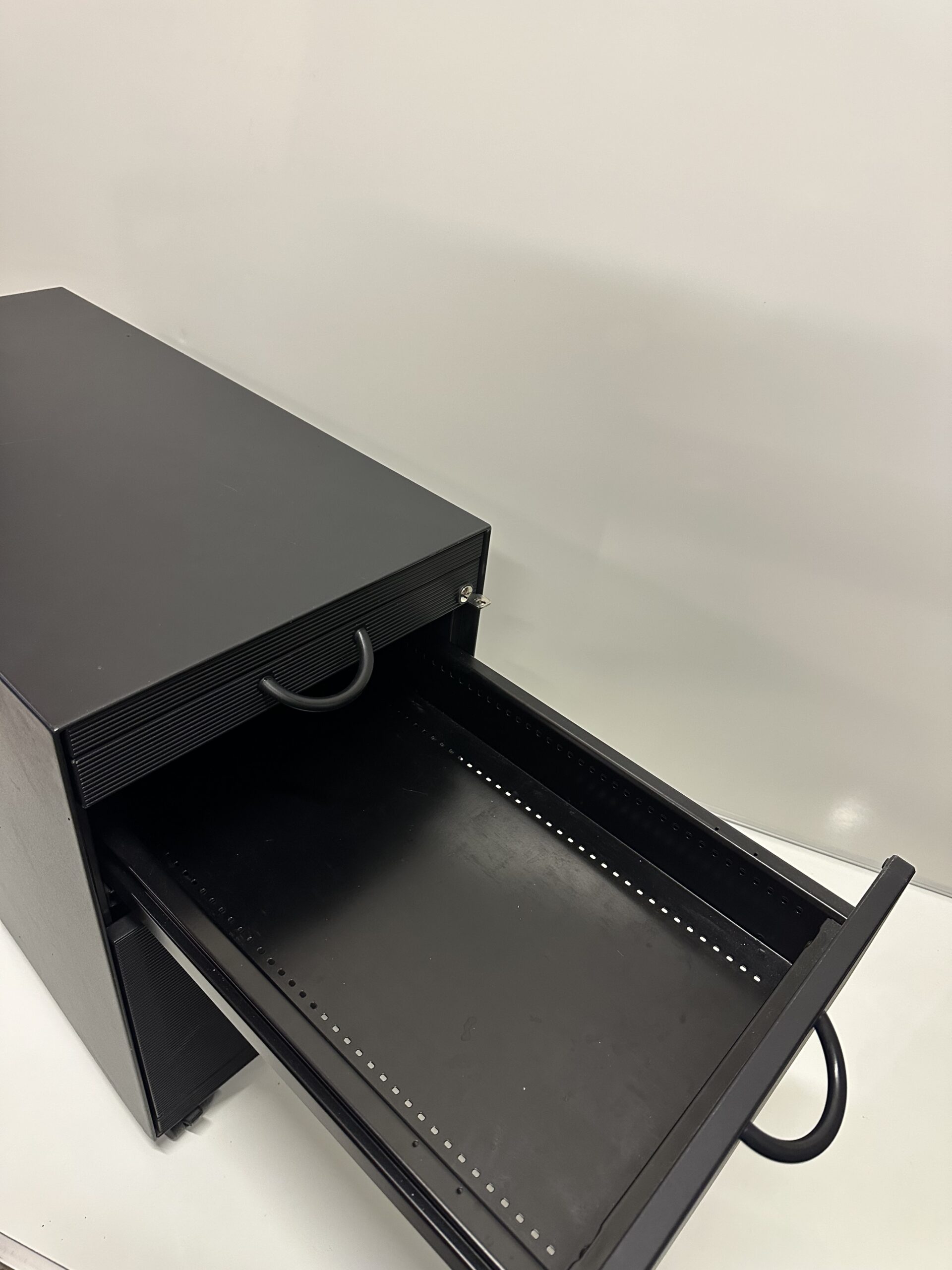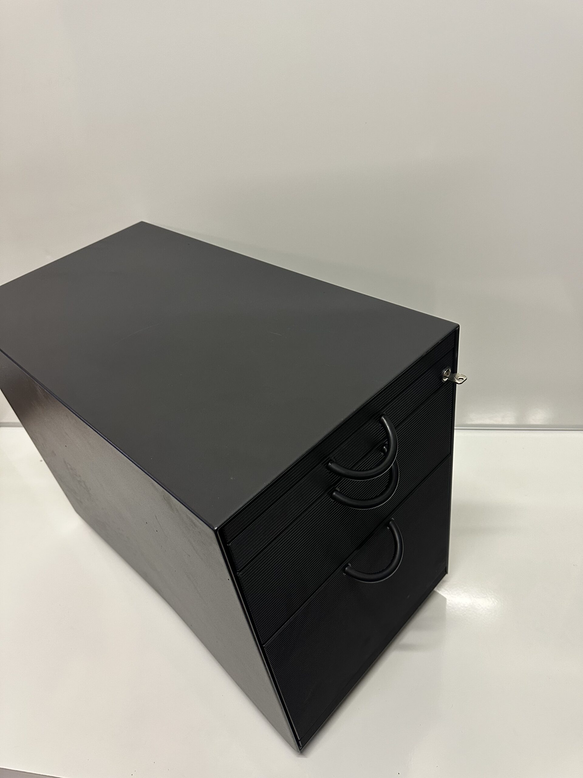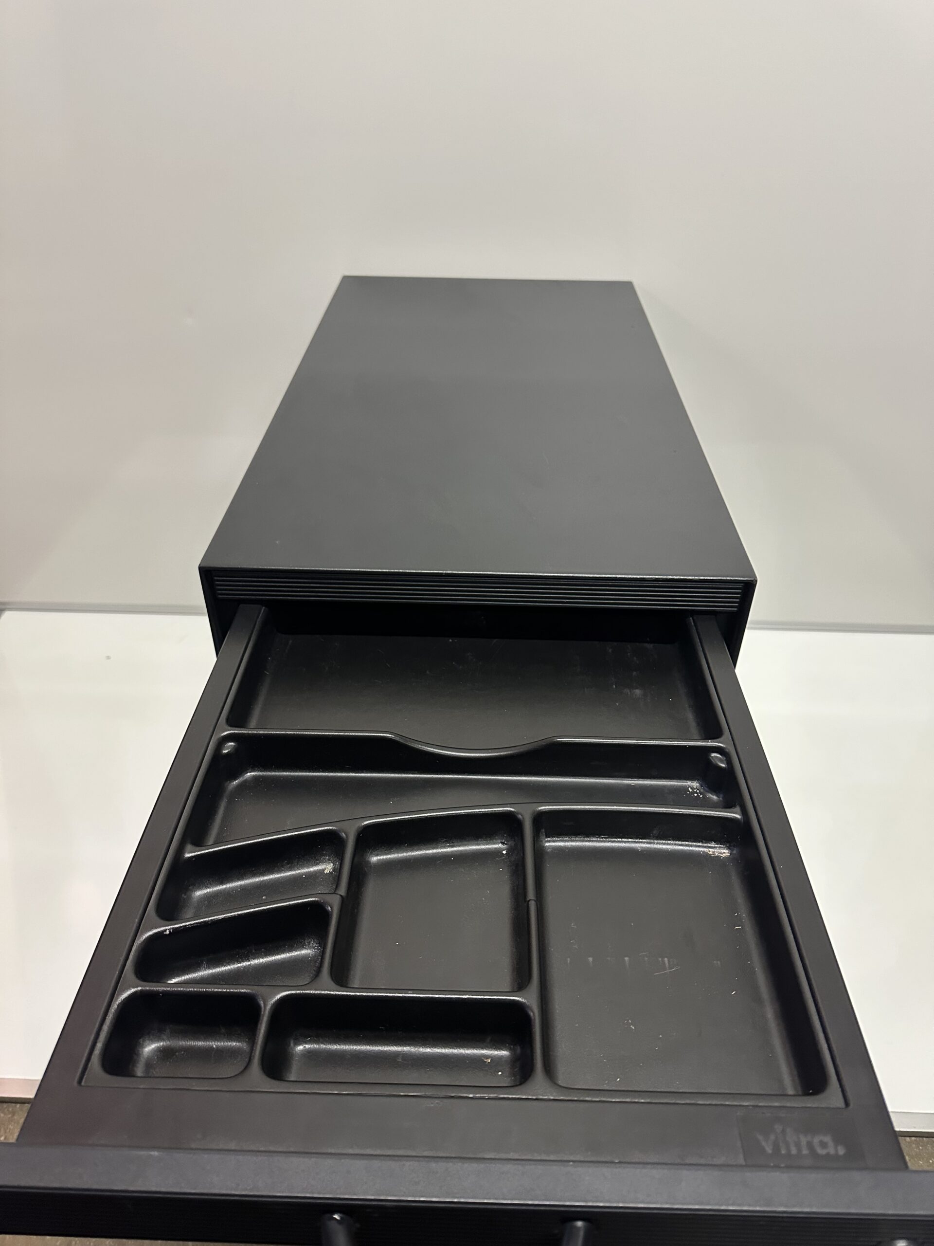 Caisson de bureau design signé Vitra, idéal pour un espace de travail moderne et organisé. Structure robuste en finition noire, équipé de 3 tiroirs, d’un organiseur intégré, d’une serrure et de roulettes pour un déplacement facile.