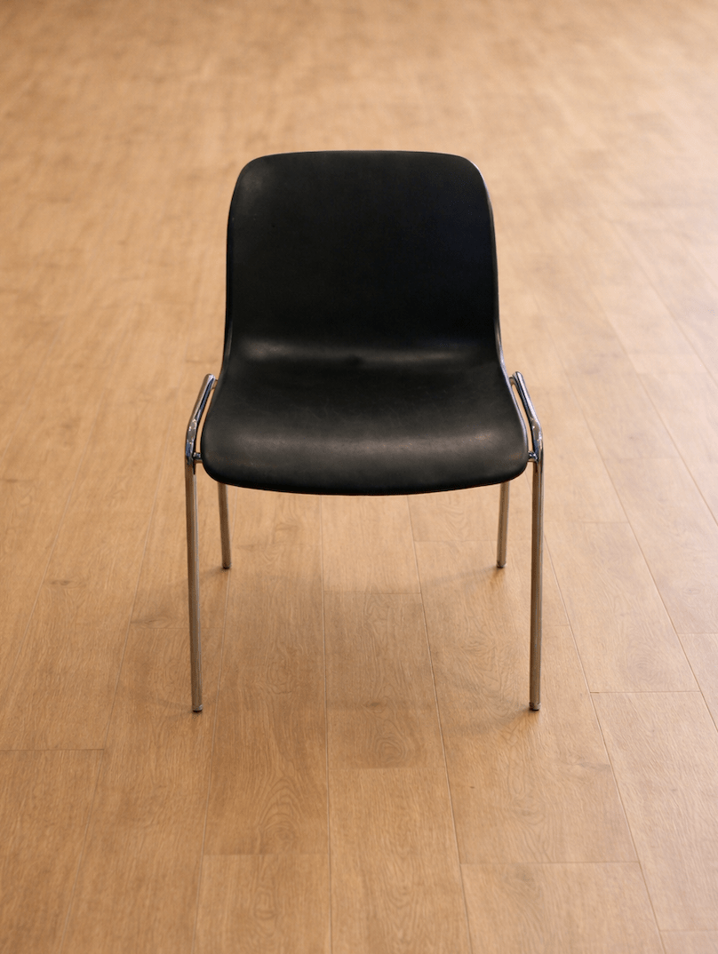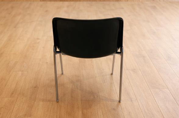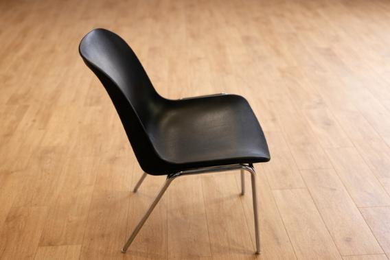 Chaise coque en plastique noir avec piètement métallique, idéale pour salle de réunion, entreprise, centre de formation ou usage domestique.
